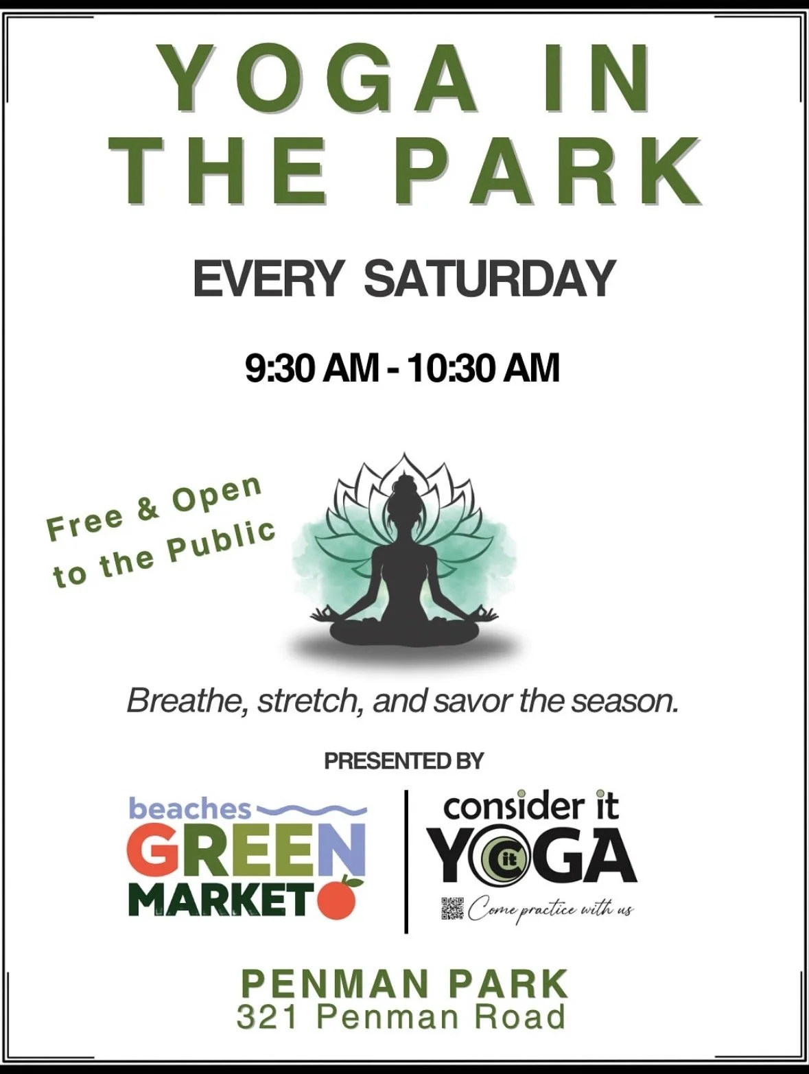 Join us every Saturday morning at Penman Park for a rejuvenating slow flow yoga class amidst the vibrant atmosphere of the Beaches Green Market!